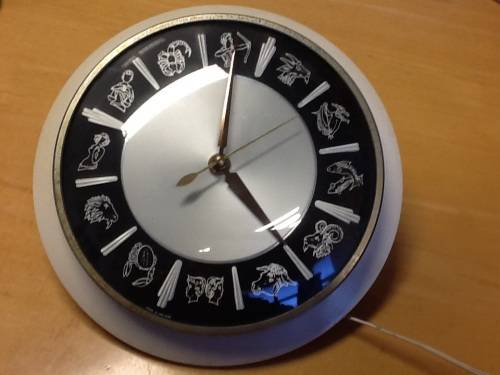 Electric Zodiac Clock. Plus minus 18 - 20 cm in diameter.  Condition age related, no cracks on glass, working.  Postage R45