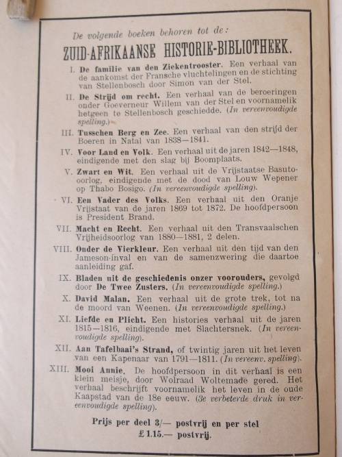 Boeke in redelike goeie toestand vir ouderdom. Kyk al die fotos asb. Gedruk deur J H de Bussy, Amsterdam. Die boeke is almal voorin geteken deur die destydse eienaar: Rietvlei, Sept 1927, J L J Viljoen.