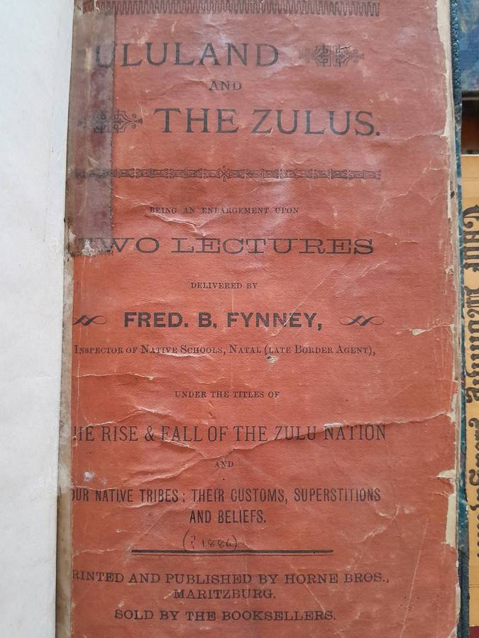 215mm x 130mm hardcover. An original pamphlet, printed and published by Horne Bros. Maritzburg, overbound in marbled paper over boards, worn and marked quarter leather with gilt spine titling "Zululand Finney 1880". Endpapers tanned and foxed, and sporadic foxing throughout. The pamphlet itself is fragile, with a tape repaired tear on the front, and all pages are discoloured but legible, with the odd pencil note. Chapters of the first lecture are: 1) The Umtetwas 2) The Lion of the Zulu Nation 3) Tyaka's Foreign Exploits 4) Dingaan and the Dutch 5) Umpande the Peaceful 6) Cetckwayo in Power 7) The Mighty Fallen. This section comprises 34 numbered pages and is followed by the index. Thereafter follows the second lecture. "Our Native Tribes: Their Customs, Superstitions and Beliefs - Lecture Delivered by Mr. Fred B. Fynney on Thursday March 5th, at the Y.M.C.A. Hall, Martizburg (Re-printed from "The Natalian)", in 18 numbered pages.