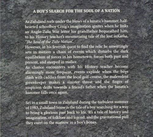 A boy's search for the soul of a nation. While Zululand reels under the blows of a lunatic's hammer, halfhearted schoolboy Craig's imagination ignites when he links an Anglo-Zulu War letter his grandfather bequeathed him, to his history teacher's mesmerizing tale of the lost inKatha, 'The Soul of the Zulu Nation'. Inspired, he resolves to find it despite the skepticism of his best friend. However, in his feverish quest to find the relic he unwittingly sets in motion a chain of events which disturbs the dark equilibrium of forces in his hometown; forces both past and present, and steeped in malice. As chance encounters with his History teacher become alarmingly more frequent, events explode when the boys clash with caddies from the local golf-course, the malevolent green keeper makes a sinister threat and the finger of suspicion drifts towards a friend's father when the lunatic's hammer falls once again. Set in a small town in Zululand during the turbulent summer of 1983, Zululand Snow is the tale of a boy searching for a way to bring a glorious past back to life.
